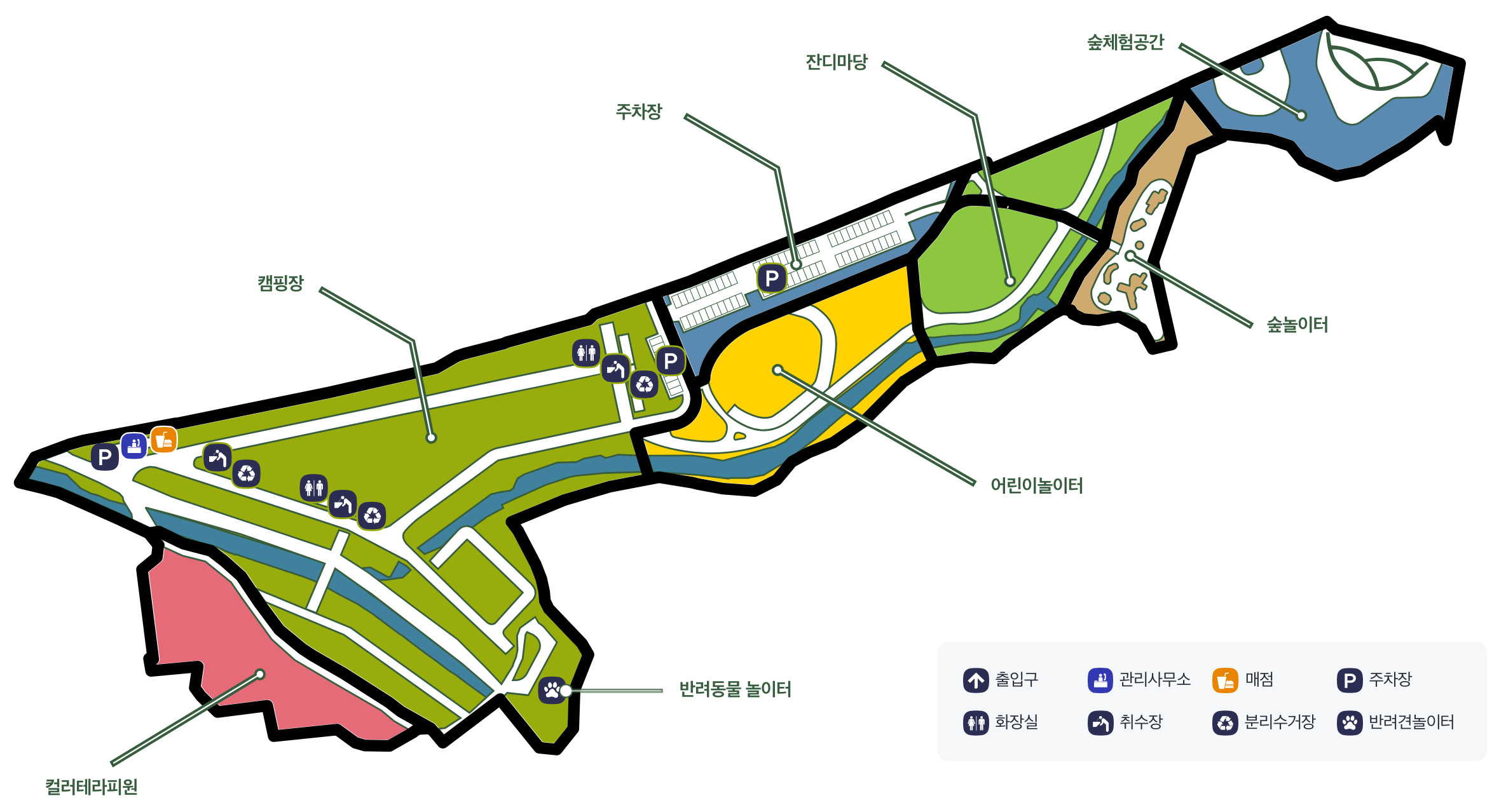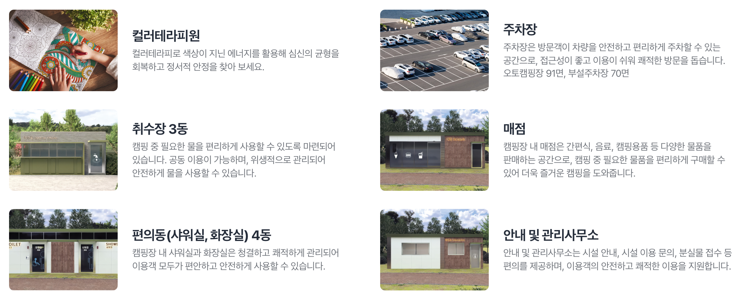● 주요 콘셉트 : 호수 뷰 + 숲 속 자연형 캠핑, 어린이·반려견 전용 놀이터, 컬러테라피원 등 테마 공간 다채롭게 배치